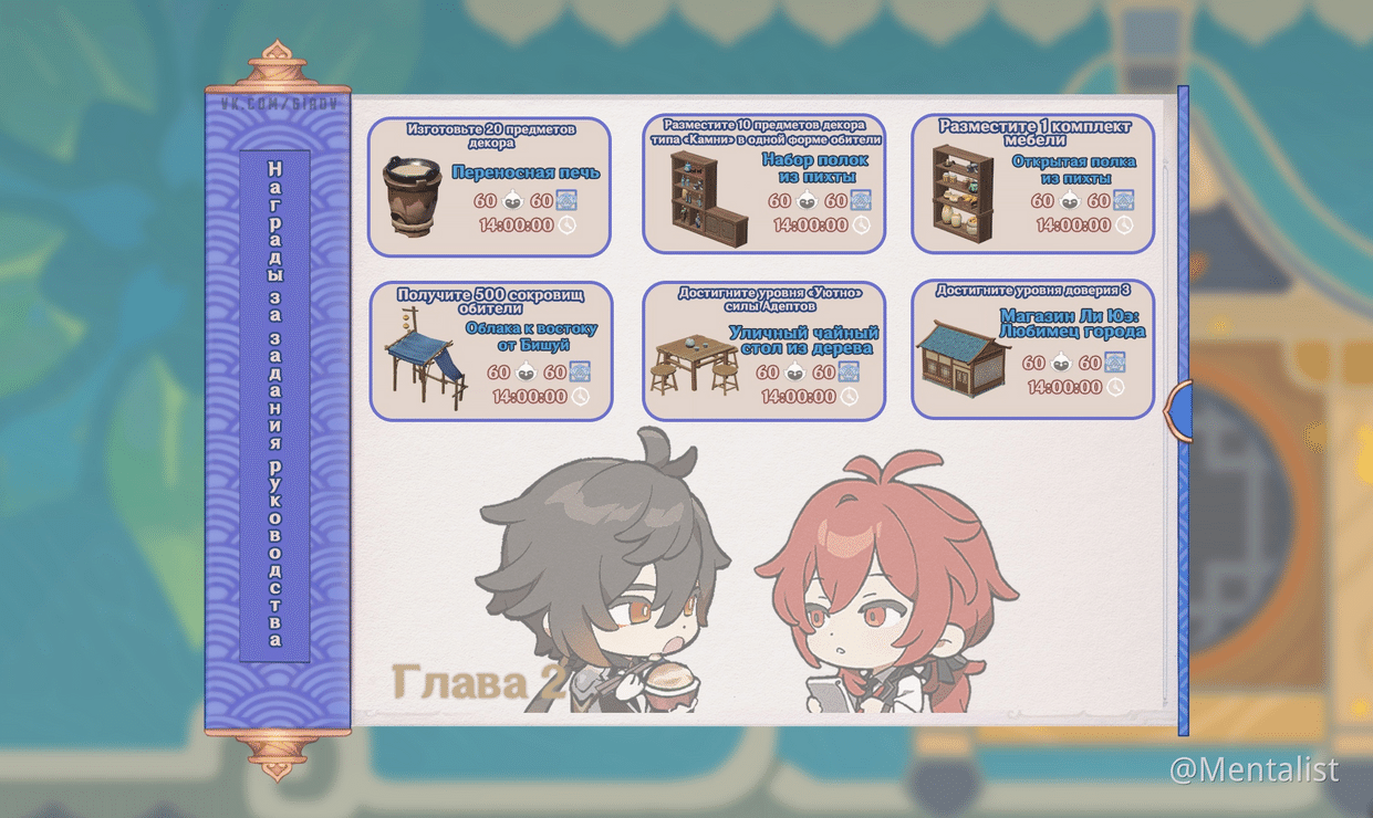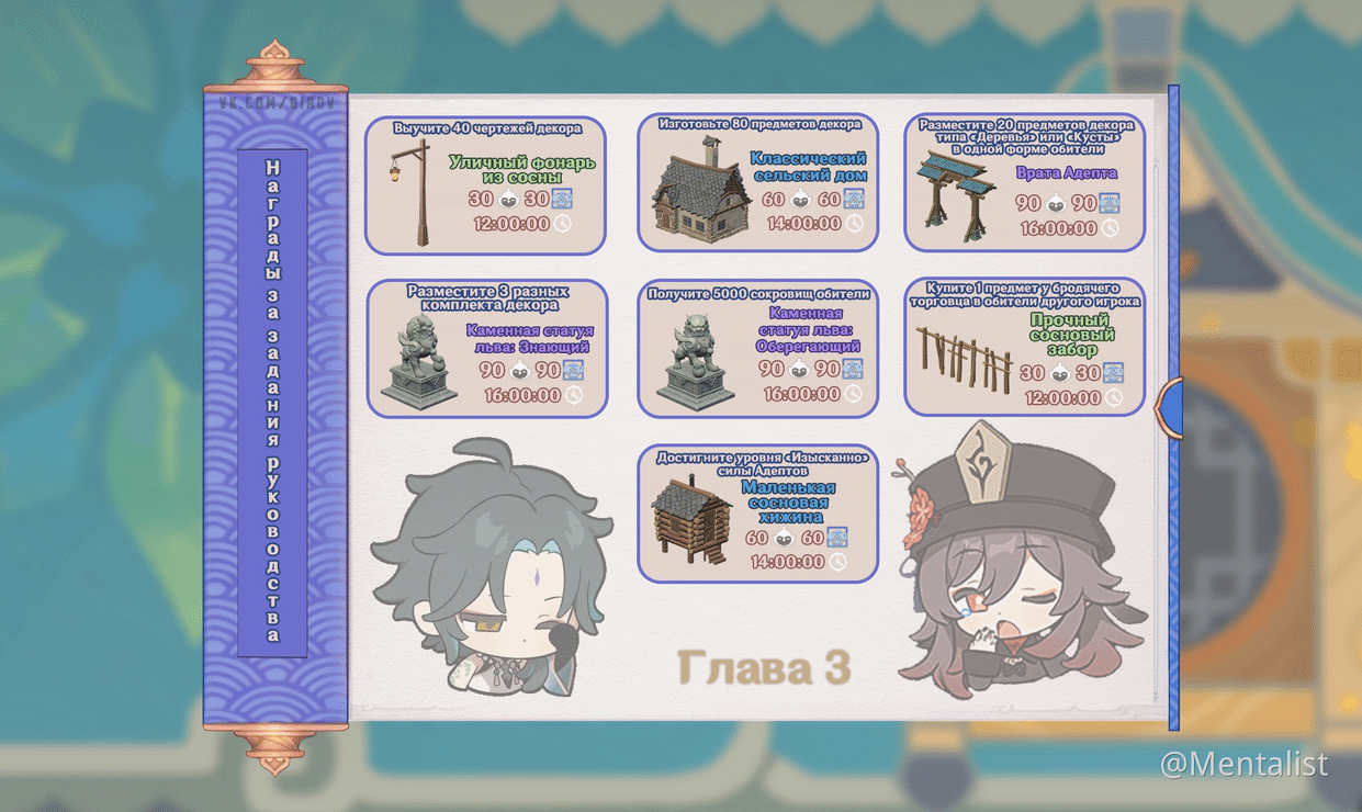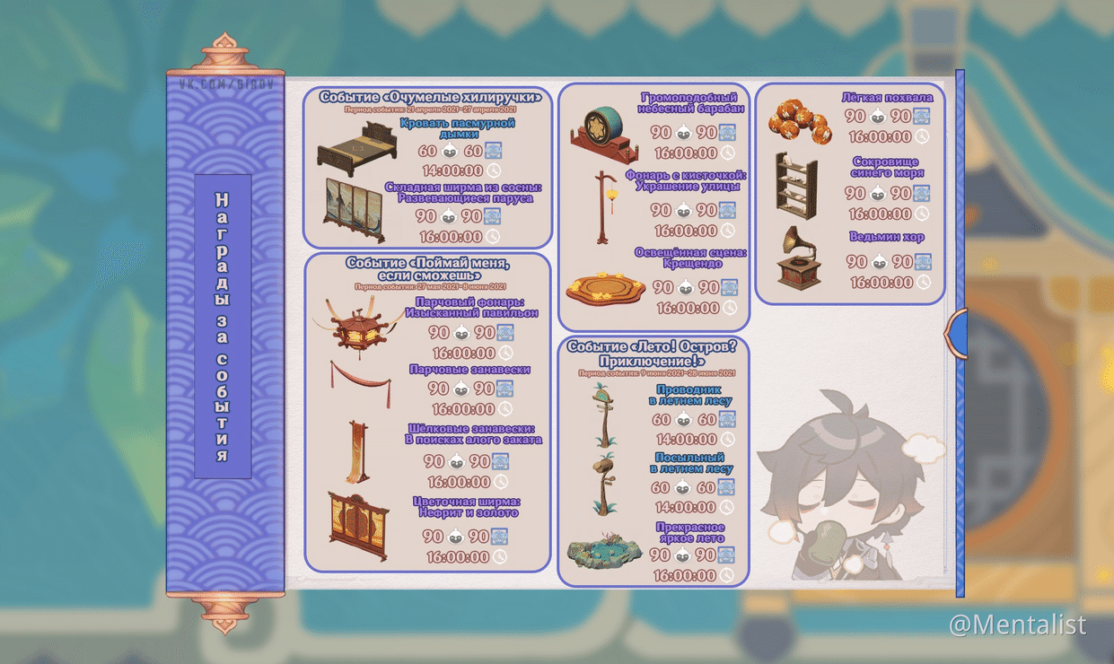 2) Событие «Поймай меня; если сможешь»: Парчовый фонарь: Изысканный павильон; Парчовые занавести; Шелковые занавески: В поисках алого заката; Цветочная ширма: Нефрит и золото; Громоподобный небесный барабан; Фонарь с кисточкой: Украшение улицы; Освещенная сцена: Крещендо