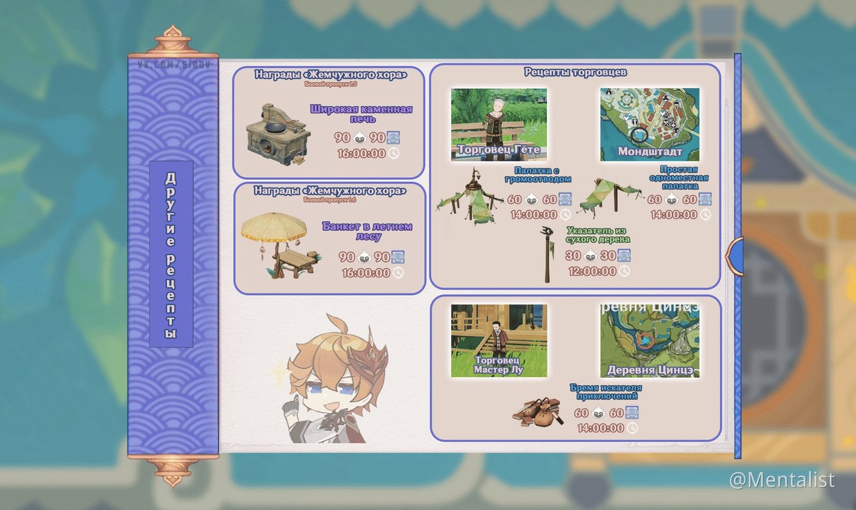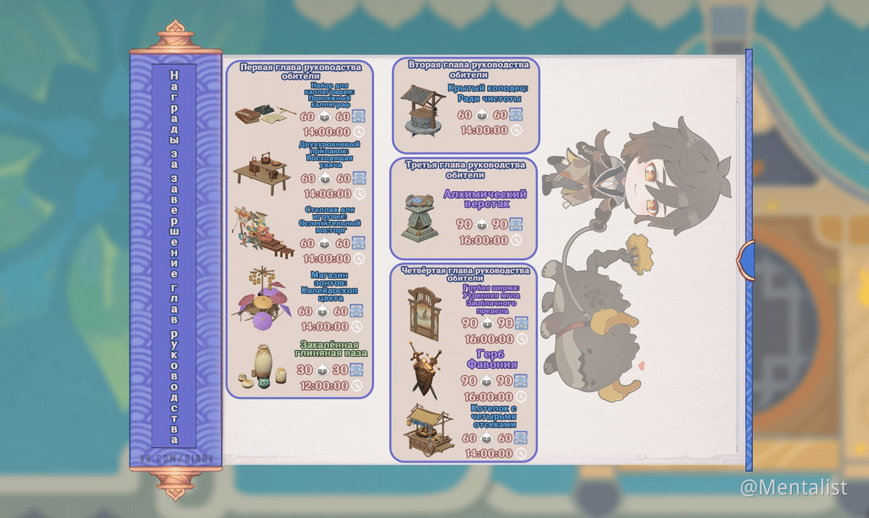 Набор для каллиграфии: Прилежный каллиграф; Закаленная глиняная ваза; Двухуровневый прилавок: Восходящая удача; Стеллаж для игрушек: Ослепительный восторг; Магазин зонтов: Калейдоскоп цвета; Крытый колодец: Ради чистоты; Алхимический верстак; Грубая ширма: Утренняя мгла Заоблачного предела; Герб Фавония; Котелок с четырьмя отсеками.