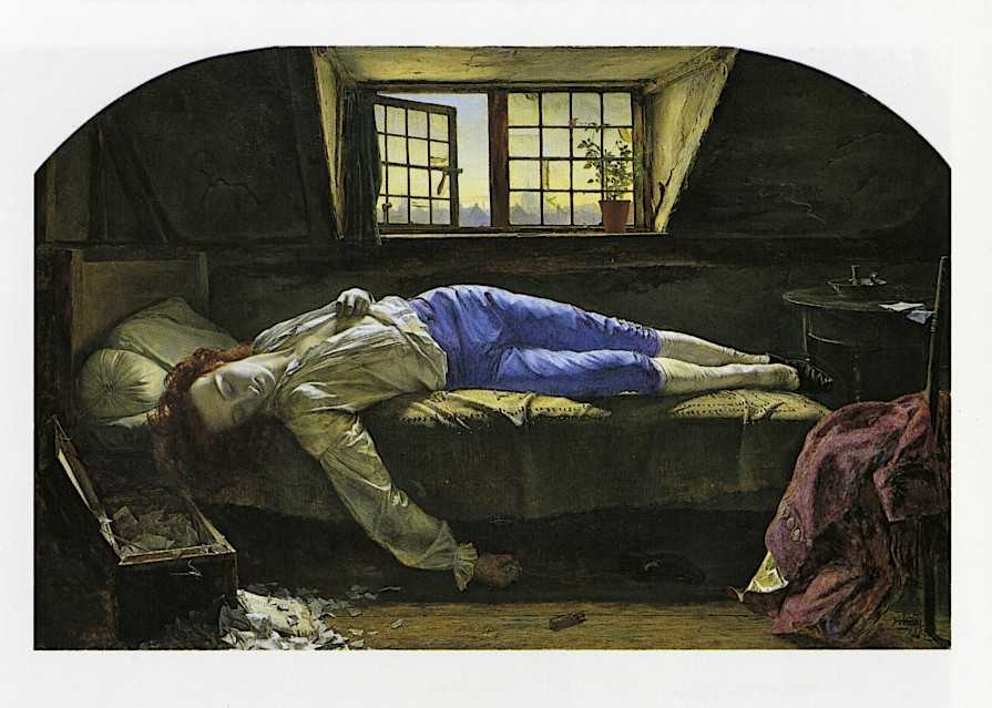 Ещё одна популярная картина прерафаэлитов — “Смерть Чаттертона”, написанная Генри Уоллисом. На картине изображен бедный поэт конца XVIII века Томас Чаттертон, который в приступе отчаяния отравился, покончив с собой (его произведения отказывались публиковать). Чаттертону на момент смерти было 17 лет. Во времена Уоллиса Чаттертон считался культовой фигурой непризнанного гения.