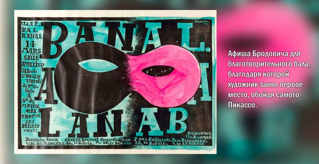 Шестнадцатилетним юношей Бродович бросает учебу и добровольцем уходит на фронт Первой мировой. Он не принимает революцию, присоединяется к Белому движению и в возрасте двадцати двух лет эмигрирует в Париж вместе с молодой женой. Там живет на Монпарнасе, заводит богемные знакомства с Сальвадором Дали, Марком Шагалом, Жаном Кокто. В скором времени становится декоратором в антрепризе Сергея Дягилева, создает афиши и декорации для «Русских сезонов». Бродович занимается всем: фотографирует танцовщиков, декорирует интерьеры домов и квартир, рисует по тканям для Модного дома Поля Пуаре, чертит эскизы мебели для Bianchini.