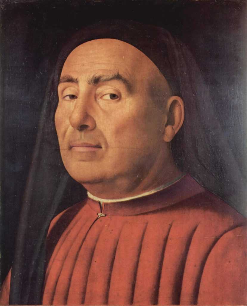 Антонелло да Мессина, как всегда, точен в мелочах, но исходит из крупного объёма. Каждая деталь – от структуры шеи до ноздрей носа, складок губ и волосков бровей тщательно прописаны, но все они сочетаются с общей формой, из которой Антонелло, подобно скульптору, создаёт объём.