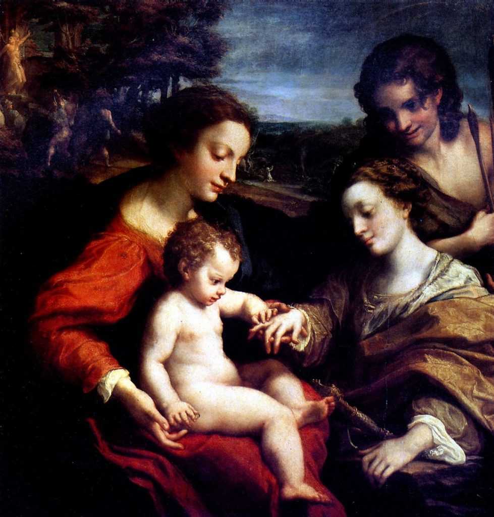 Мадонна с младенцем и святыми, 1523. Дерево, масло, 205*141 см. Национальная галерея, Парма. Алтарная картина с Девой Марией, Иоанном Крестителем, Марией Магдалиной и святым Иеронимом — одно из известнейших произведений мастера, передает целый спектр чувств: душевную мягкость Мадонны, нежность, благоговение окружающих ее людей. Композиционное построение искусно соединяет фигуры первого плана с изображением пейзажа. Художник оказал большое влияние на религиозное искусство Возрождения. Мягкий и спокойный колорит его произведений нашел продолжение в живописи барокко.