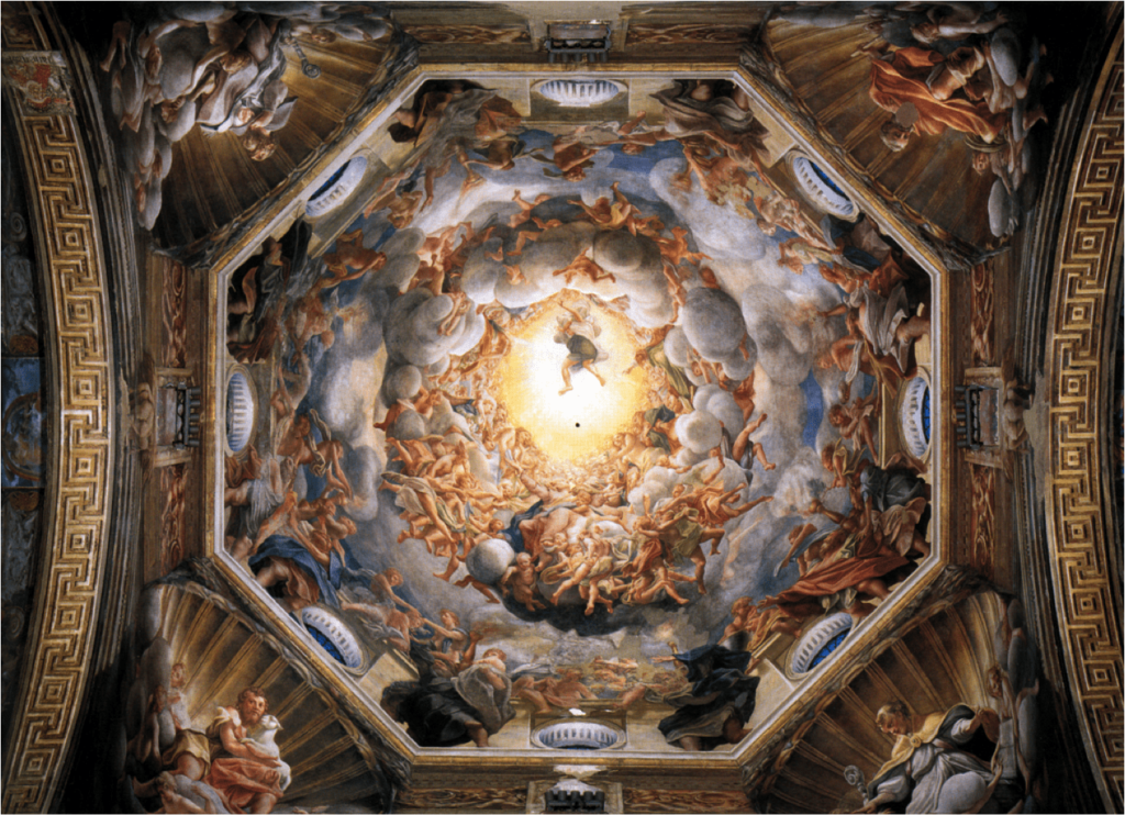 Вознесение Богородицы. Произведение было одним из первых образцов эффекта барочного иллюзионизма. Его композиция весьма неординарна. На балюстраде, окружающей купольную фреску, изображены фигуры апостолов, в центре — Дева Мария. Ее окружают облака, на которых восседают ангелы, святые и патриархи, как будто растворясь в лучезарном свете. Фреска создает ощущение легкости, воздушности и бесконечности, достигаемое за счет искажения перспективы и тщательно продуманной передачи света. Возникает ощущение полной невесомости и бесконечности, исключительной пространственной глубины.