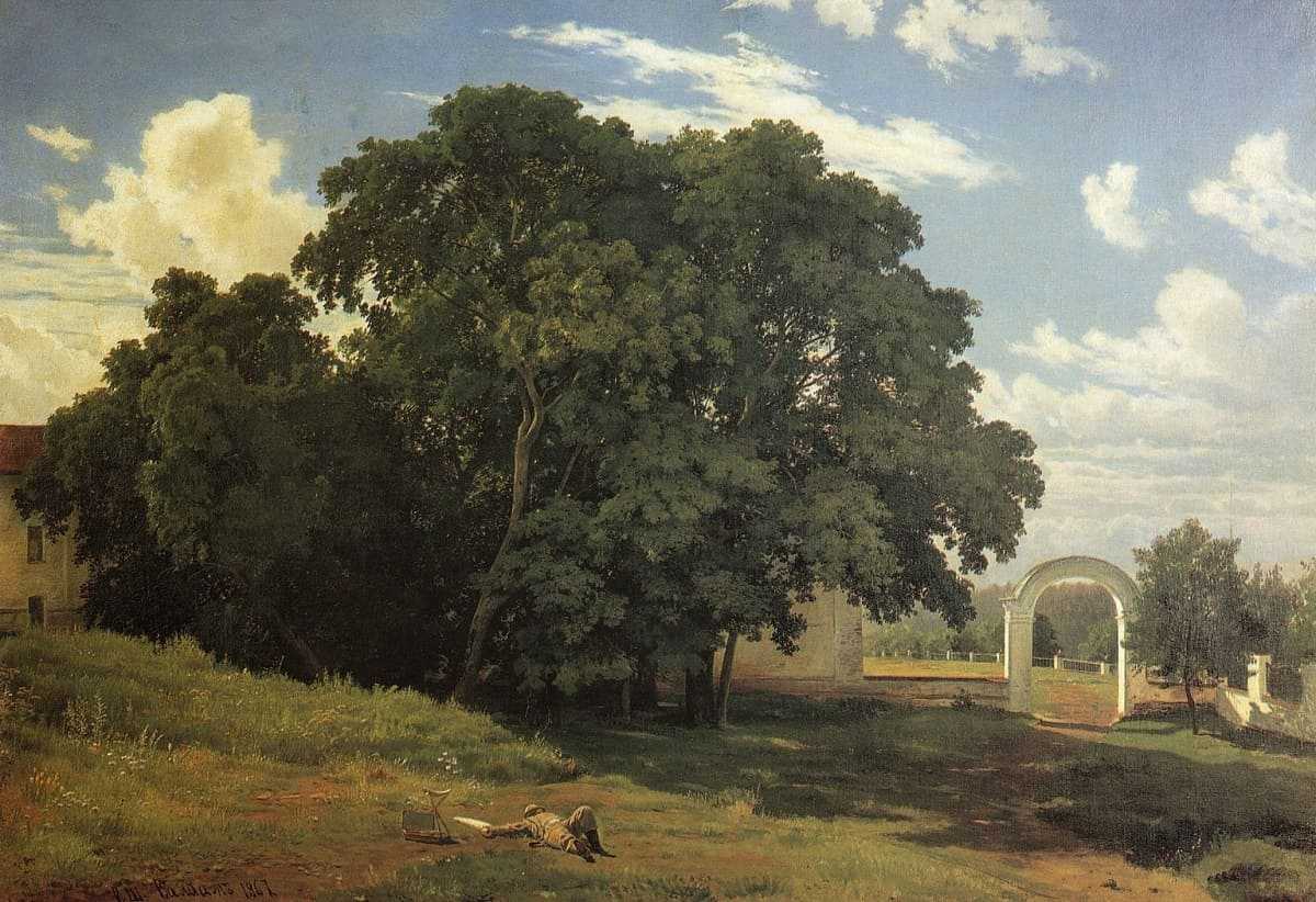 Центральное место в пейзаже занимают высокие сосны. Однако их облик больше напоминает северную природу России, по которой тосковал автор.