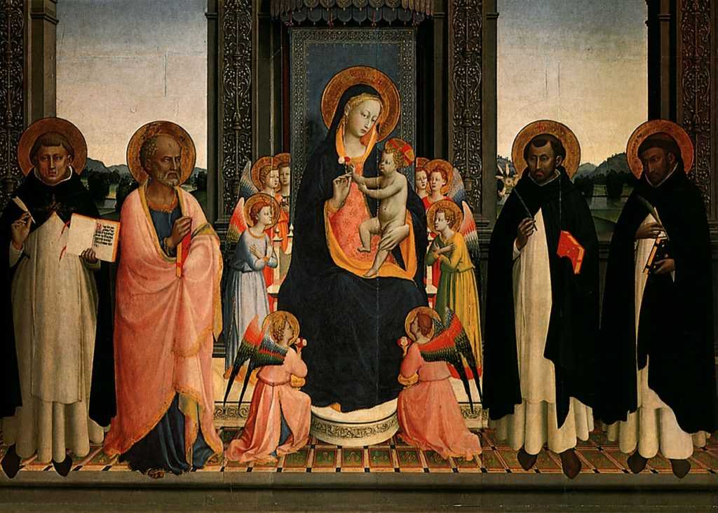 Мадонна с младенцем, ангелами и святыми, около 1440. Дерево, масло, 220*227 см. Музей монастыря Сан Марко, Флоренция. Икона написана для верхнего алтаря собора Сан Марко и посвящена как заказчику произведения — Козьмо Медичи (1389–1464), так и монахам-доминиканцам, которым принадлежал собор. На ней также изображены все небесные покровители семейства Медичи. Открытое Евангелие от Марка свидетельствует об обете бедности, приносимом членами ордена. Необычен прямоугольный формат полотна, благодаря которому стал возможен отказ от алтарной композиции, состоящей из многих частей, а также центральная перспектива.