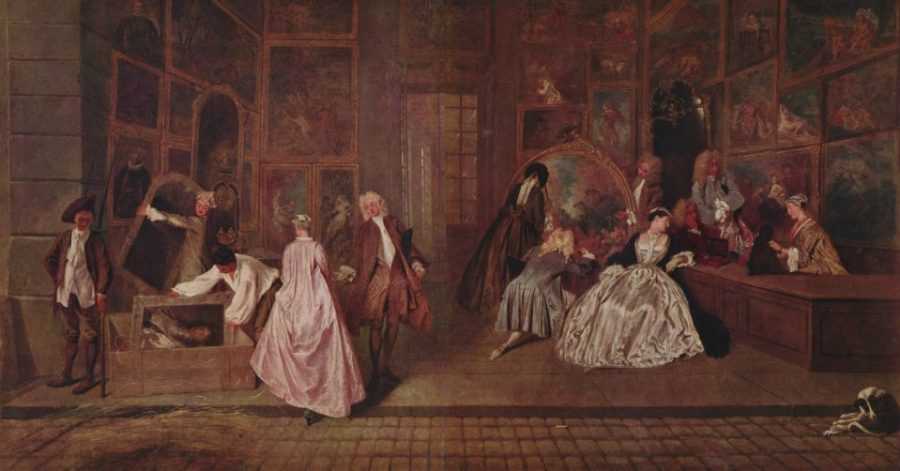 Казалось бы, это просто бытовая сцена. Посетители рассматривают картины. Но у Ватто же всегда что-нибудь ещё заложено.