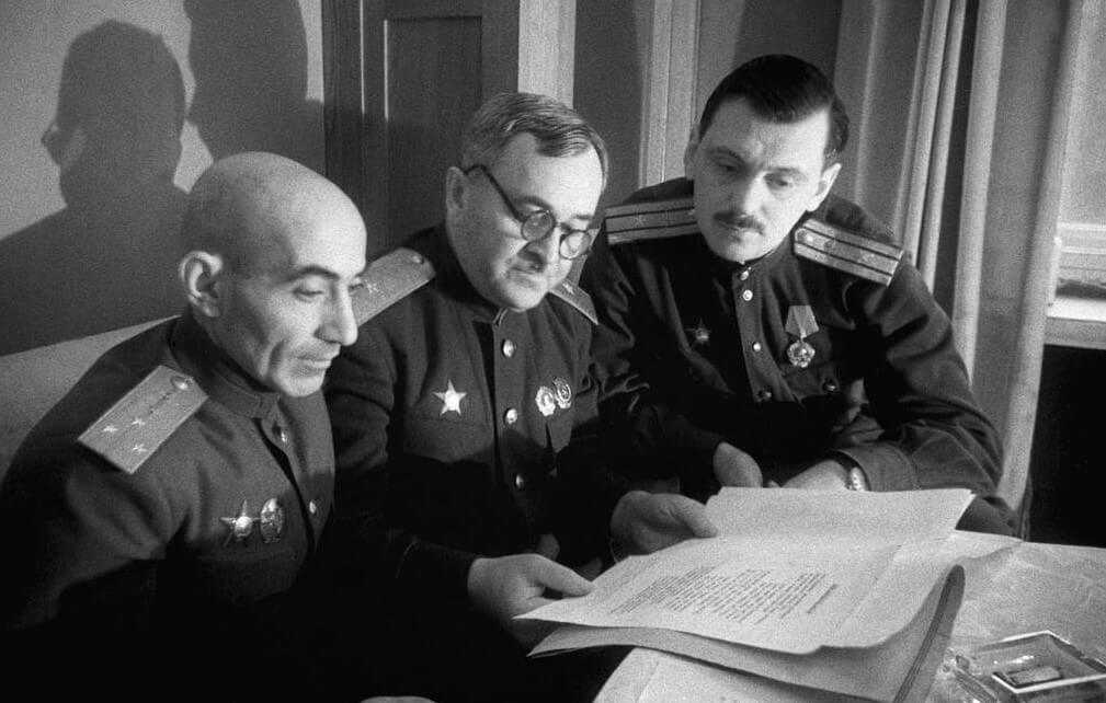 Писатель Г. А. Эль-Регистан, лауреат Государственной премии народный артист СССР, профессор, генерал-майор А. В. Александров и лауреат Государственной премии поэт С. В. Михалков. 1943 год