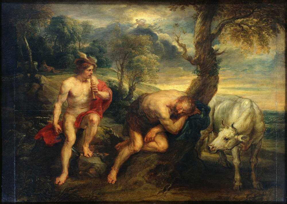 «Пейзаж с Аполлоном и Меркурием», Клод Лоррен. Написана в 1645 году. Галерея Дориа-Памфили в Риме. По легенде, Аполлон, бог солнца и солнечной энергии, сам отдал Гермесу своё стадо в обмен на лиру. Лиру, как и другие музыкальные инструменты, Гермес изобрёл сам. На картине Меркурий как раз угоняет коров Аполлона на фоне заката, стоит тёплый вечер, возможно, всё происходит в майские дни.