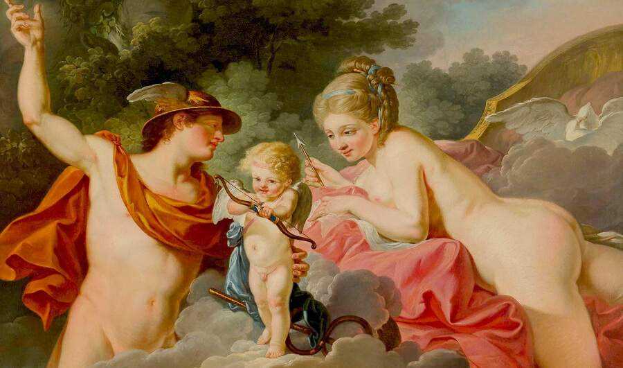 Картины бога Меркурия, Афродиты и Амура (Купидона) встречаются нередко, хотя по сути нет легенд, рассказывающих о взаимодействии этих троих богов и того, что Гермес – покровитель Амура. Тем не менее, сами картины проникнуты теплом, одухотворённостью и светом, они всегда в светлых тонах и навевают спокойствие. Зачастую изображены сцены того, как Меркурий учит чему-либо Купидона (Амура).