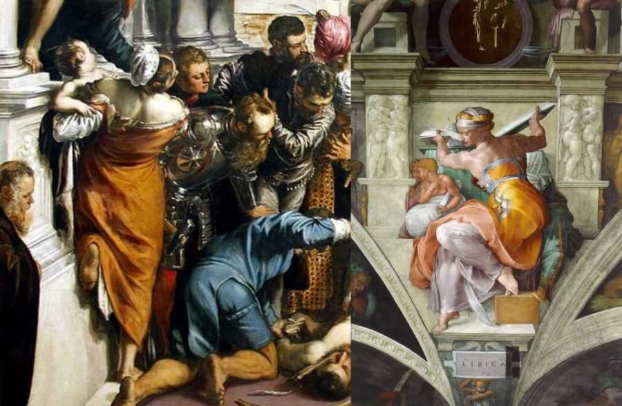 Слева: Тинторетто. Фрагмент “Чуда святого Марка”. 1848 г. Галерея Академии, Венеция. Справа: Микеланджело. Ливийская сивилла. 1508-1512 гг. Часть росписи Сикстинской капеллы в Ватикане