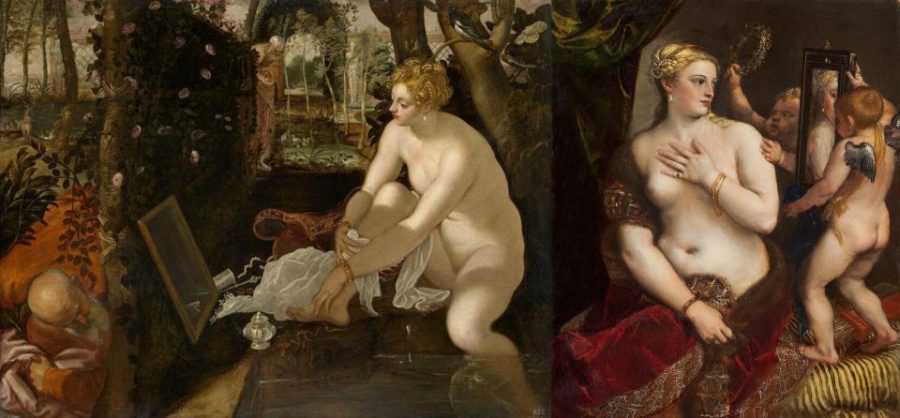 Слева: Тинторетто. Сусанна и старцы. 1555-1556 гг. Музей истории искусств, Вена. Справа: Тициан. Венера перед зеркалом. 1555 г. Лондонская национальная галерея