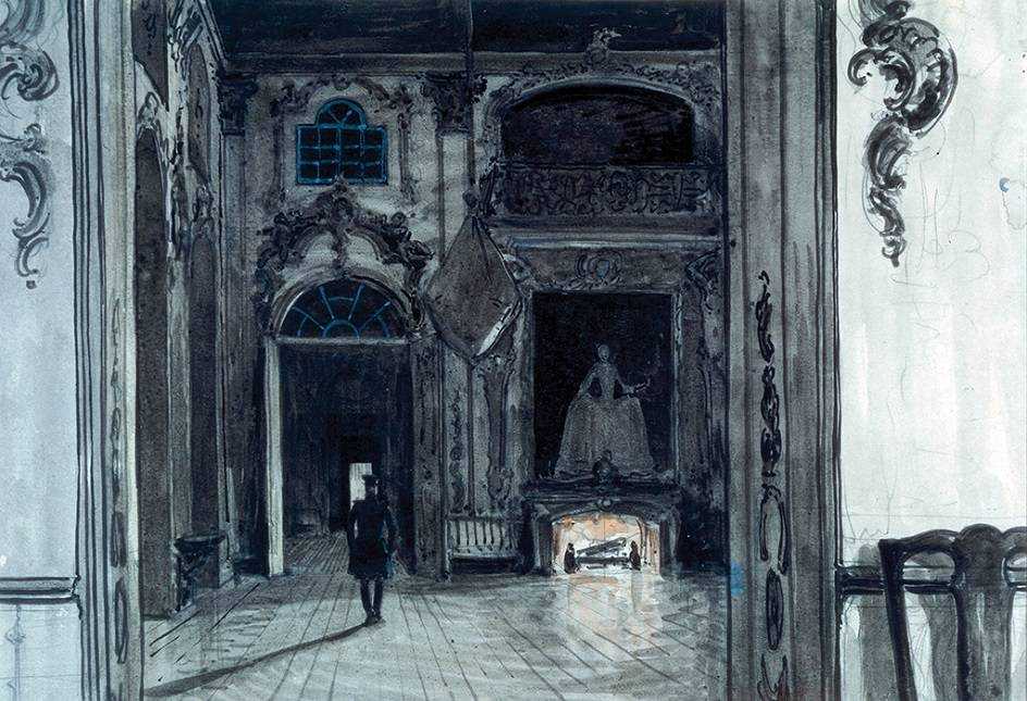 Романтический Михайловский замок предстает на рисунке Бенуа во всем великолепии и блеске тех недолгих сорока дней февраля – марта 1801 года, когда он являлся царской резиденцией. На площади перед замком, с которого еще не сняты строительные леса, Павел принимает парад. Тема парада выбрана не случайно. Каждое движение затянутых в зелено-красную прусскую форму «оловянных солдатиков» со смешными косичками рассчитано и выверено, все подчинено общему порядку и ритму, здесь нет места ничему, что не предусматривал бы устав. Парад – своего рода символ павловской эпохи, так мрачно и таинственно закончившейся убийством Павла I в Михайловском замке 11 марта 1801 года.