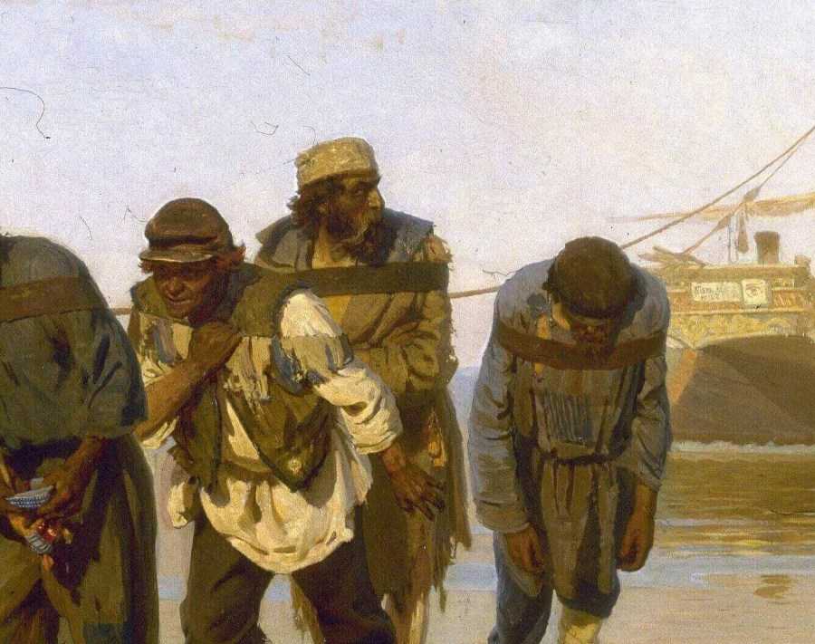 Они все тянут крепкую верёвку, к которой привязано судно. Их лица суровы и печальны, а тела напряжены и измучены нечеловеческой работой.