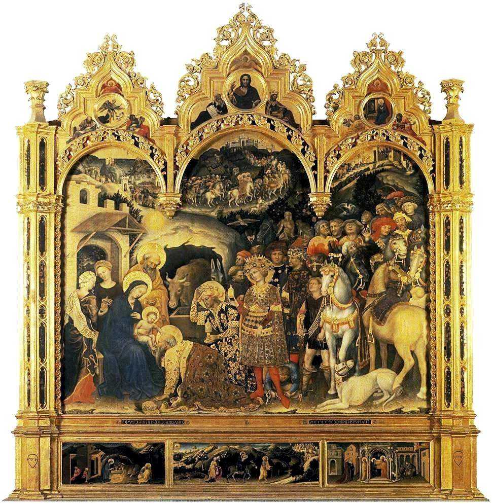 Алтарь «Поклонение волхвов» мастер создал для капеллы Строцци церкви Санта-Тринита во Флоренции. Многолюдная красочная процессия изображена движущейся по направлению к переднему плану картины. Евангельская история о царях, пришедших поклониться Младенцу Христу, трактована здесь в духе средневекового рыцарского романа: одному из волхвов слуга подвязывает шпору, что подчеркивает принадлежность его хозяина к рыцарству, в картину вкраплены сценки охоты, а манеру многих персонажей держаться можно определить словом «куртуазная» — достаточно взглянуть, например, на служанок слева. Это произведение интересно рассматривать, потому что оно полно дивных подробностей, например Младенец Христос гладит по голове пожилого волхва, целующего Ему ножку. Среди пришедших издалека кого только нет — молодые и пожилые, рыцари и охотники. В картине присутствуют не только люди, но и животные — лев, гепард, обезьяны, сокол. Создается впечатление, что художник использовал сюжет еще и ради того, чтобы изобразить богатство ведомого ему мира.