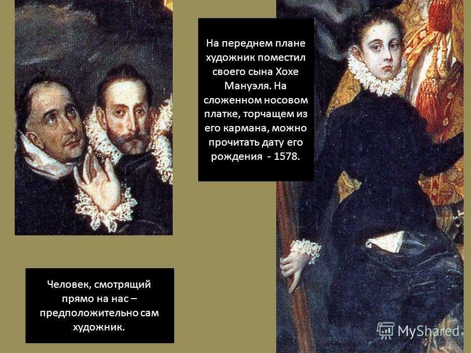 Человек, смотрящий прямо на нас – предположительно сам художник. На переднем плане художник поместил своего сына Хохе Мануэля. На сложенном носовом платке, торчащем из его кармана, можно прочитать дату его рождения
