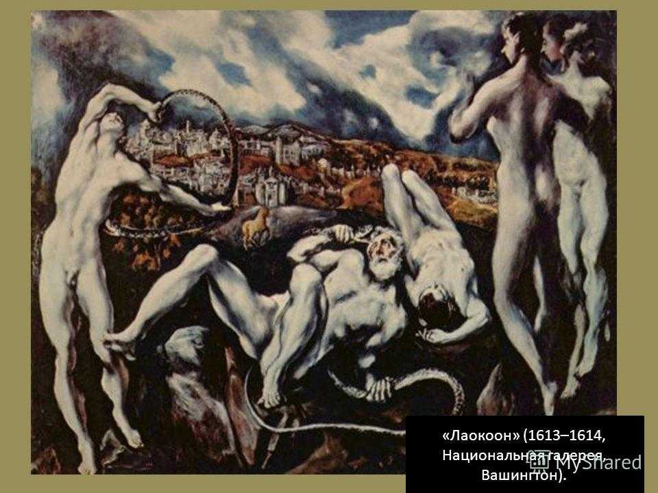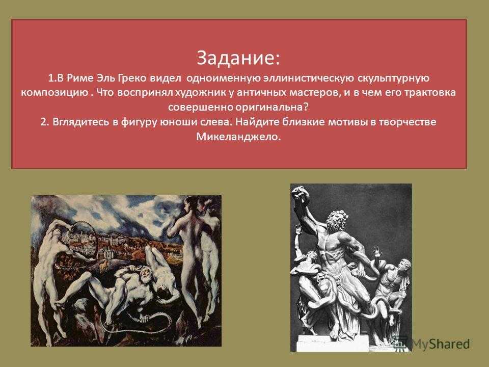 Задание: 1.В Риме Эль Греко видел одноименную эллинистическую скульптурную композицию. Что воспринял художник у античных мастеров, и в чем его трактовка совершенно оригинальна? 2. Вглядитесь в фигуру юноши слева. Найдите близкие мотивы в творчестве Микеланджело.