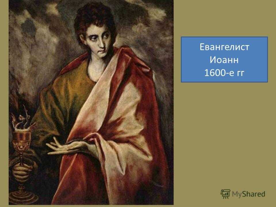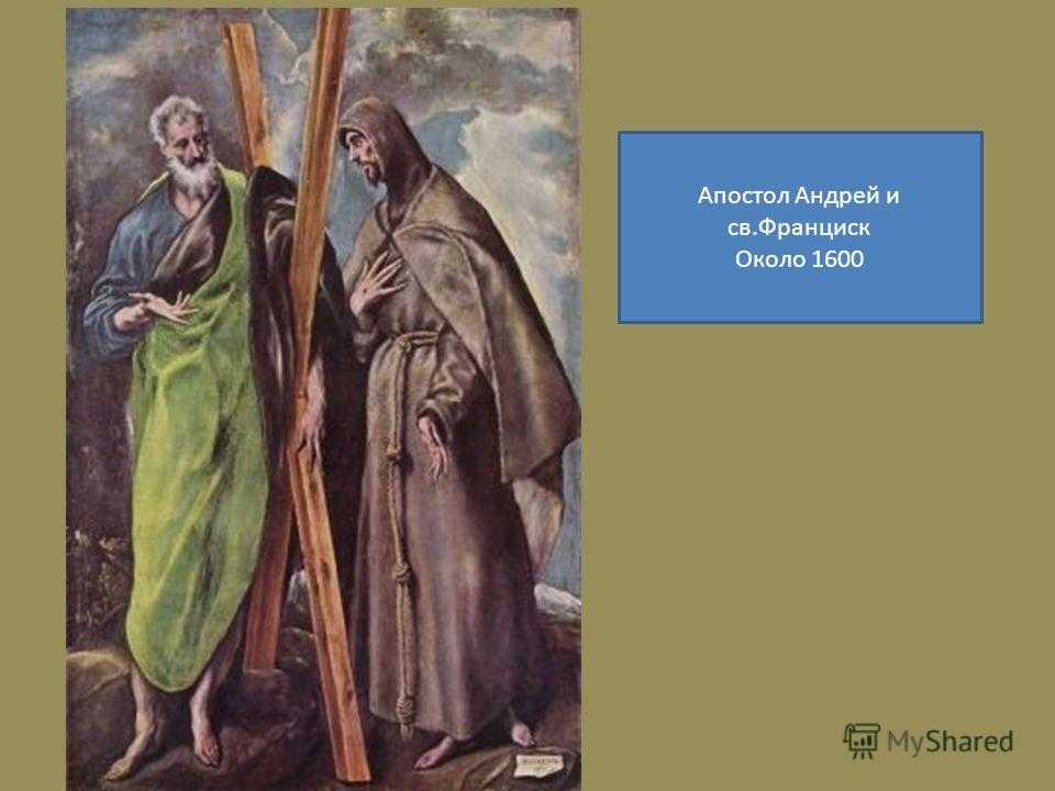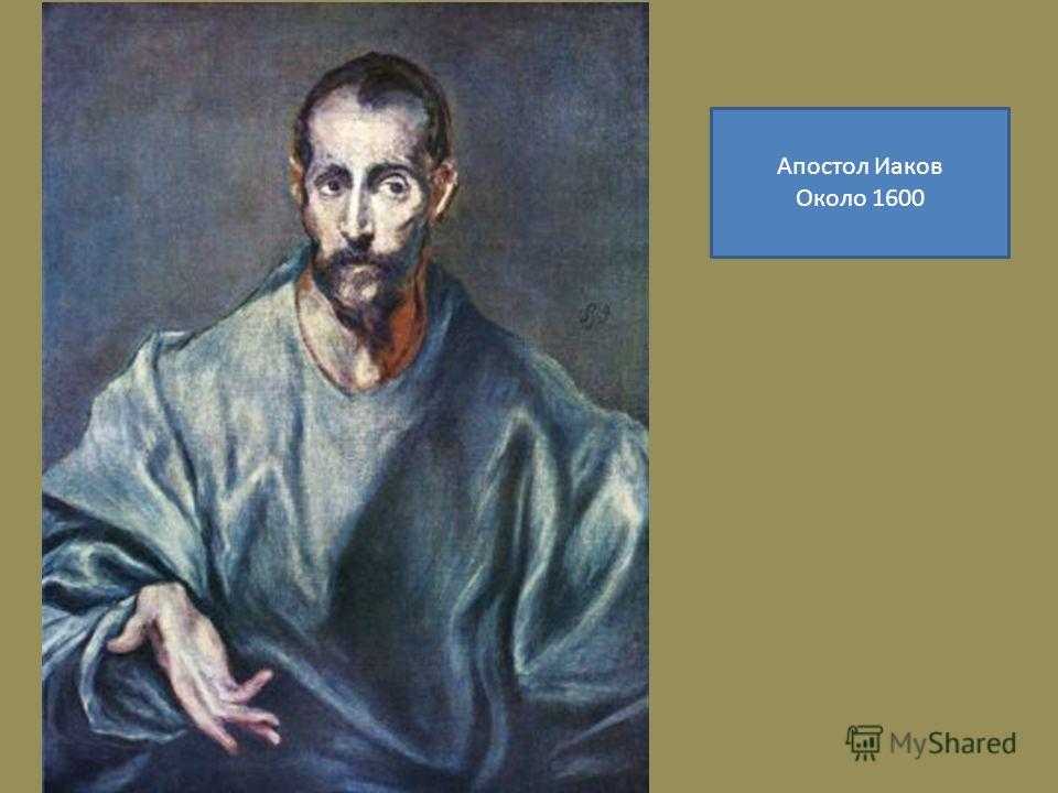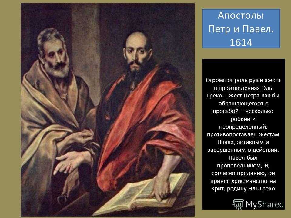 Апостолы Петр и Павел Огромная роль рук и жеста в произведениях Эль Греко=. Жест Петра как бы обращающегося с просьбой – несколько робкий и неопределенный, противопоставлен жестам Павла, активным и завершенным в действии. Павел был проповедником, и, согласно преданию, он принес христианство на Крит, родину Эль Греко