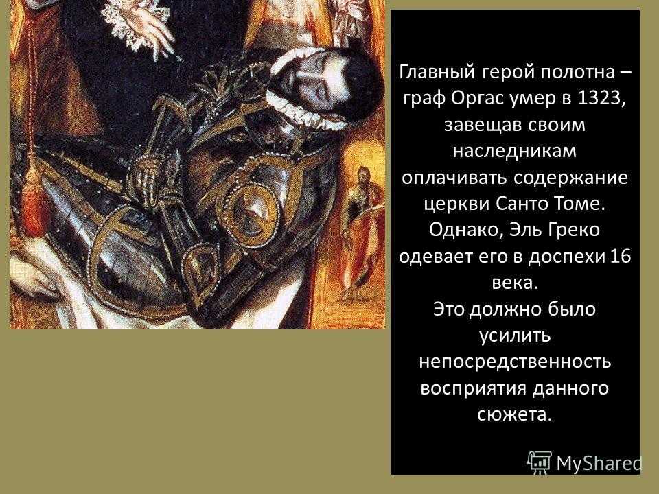 Главный герой полотна – граф Оргас умер в 1323, завещав своим наследникам оплачивать содержание церкви Санто Томе. Однако, Эль Греко одевает его в доспехи 16 века. Это должно было усилить непосредственность восприятия данного сюжета.