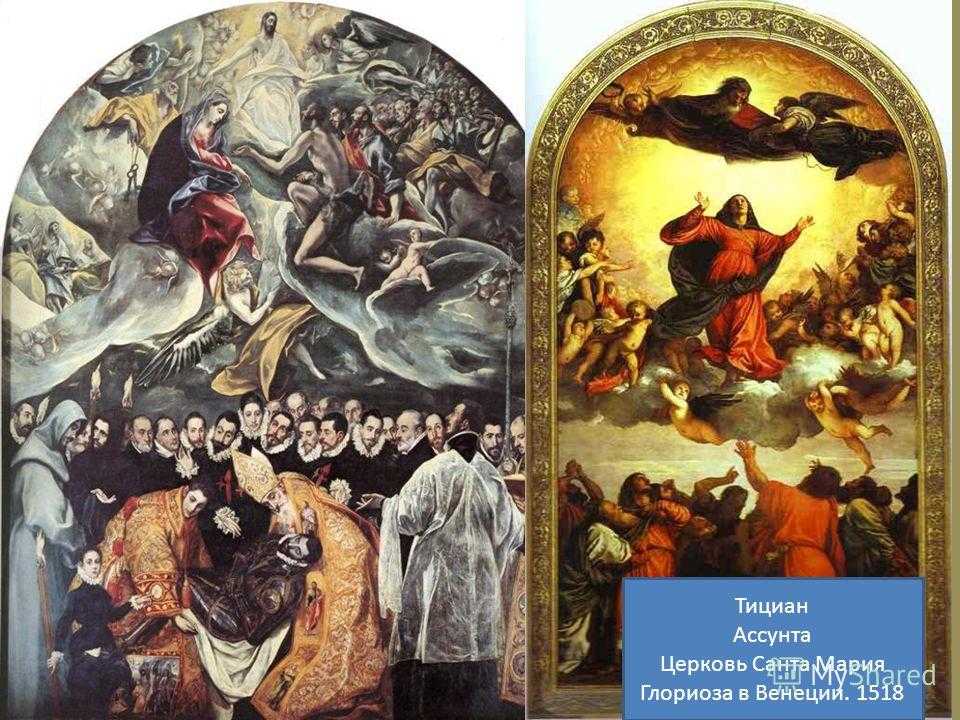 С другой стороны, Гарольд Вети отвергает как «неубедительное» мнение о том, что композиция Погребения заимствована из Успения , «поскольку работа более непосредственно связана с прототипами итальянского Возрождения». В связи с устранением пространственной глубины за счет сжатия фигур на переднем плане упоминаются ранние флорентийские маньеристы — Россо Фиорентино , Понтормо и Пармиджанино , а также две картины Тинторетто : Распятие и Воскресение Лазаря , последнее из-за горизонтальный ряд зрителей за чудом. Говорят, что эллиптическая группа двух святых, опускающих мертвое тело, ближе к раннему » Погребению» Тициана, чем к любой другой работе. Уети утверждает, что «маньеристский метод композиции Эль Греко нигде не выражен более четко, чем здесь, где все действие происходит во фронтальной плоскости».