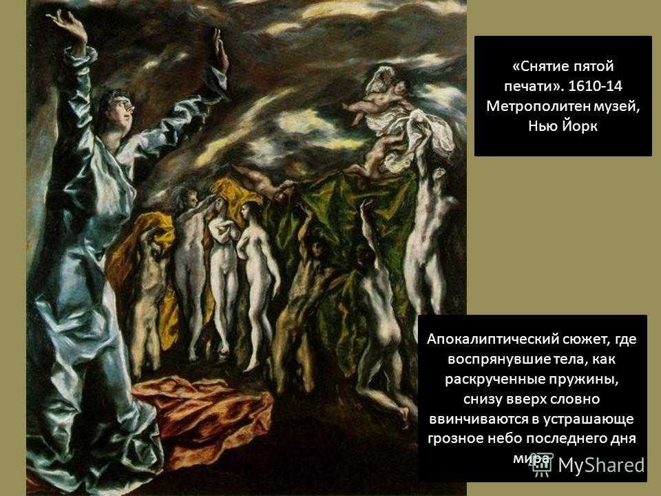Апокалиптический сюжет, где воспрянувшие тела, как раскрученные пружины, снизу вверх словно ввинчиваются в устрашающе грозное небо последнего дня мира «Снятие пятой печати» Метрополитен музей, Нью Йорк