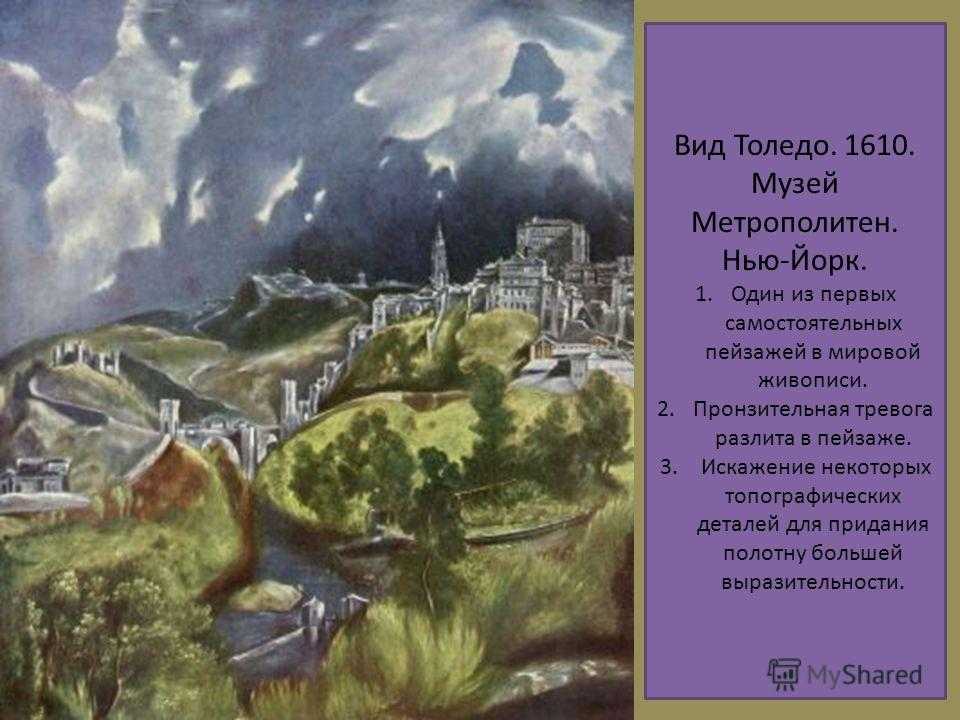 Вид Толедо Музей Метрополитен. Нью-Йорк. 1.Один из первых самостоятельных пейзажей в мировой живописи. 2.Пронзительная тревога разлита в пейзаже. 3. Искажение некоторых топографических деталей для придания полотну большей выразительности.