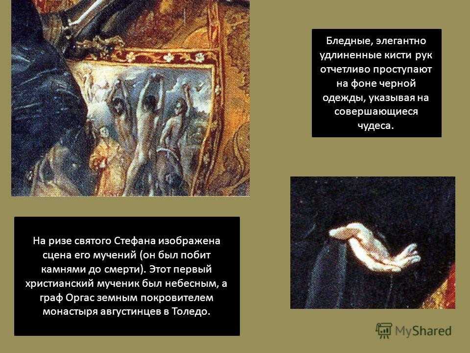 На ризе святого Стефана изображена сцена его мучений (он был побит камнями до смерти). Этот первый христианский мученик был небесным, а граф Оргас земным покровителем монастыря августинцев в Толедо. Бледные, элегантно удлиненные кисти рук отчетливо проступают на фоне черной одежды, указывая на совершающиеся чудеса.