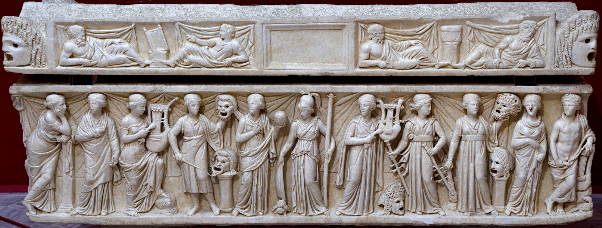 Девять муз, Афина и Аполлон. Фронтальный вид саркофага с крышкой. Тасосский мрамор. Середина II в. н. э. Археологический музей. Остия, Италия