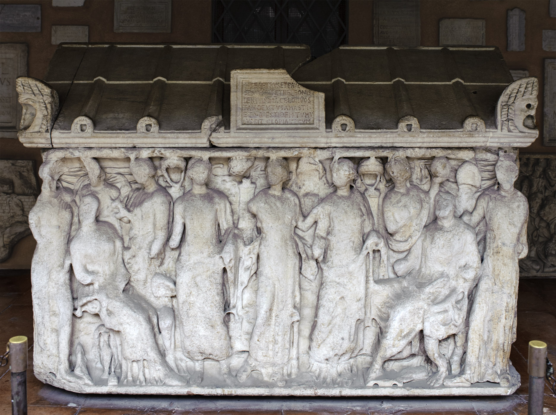 Саркофаг с изображением муз на фронтальной панели (известный как саркофаг папы Анаклета II) с двускатной крышкой от другого саркофага. Базилика Святого Павла за городскими стенами, клуатр. Рим, Италия