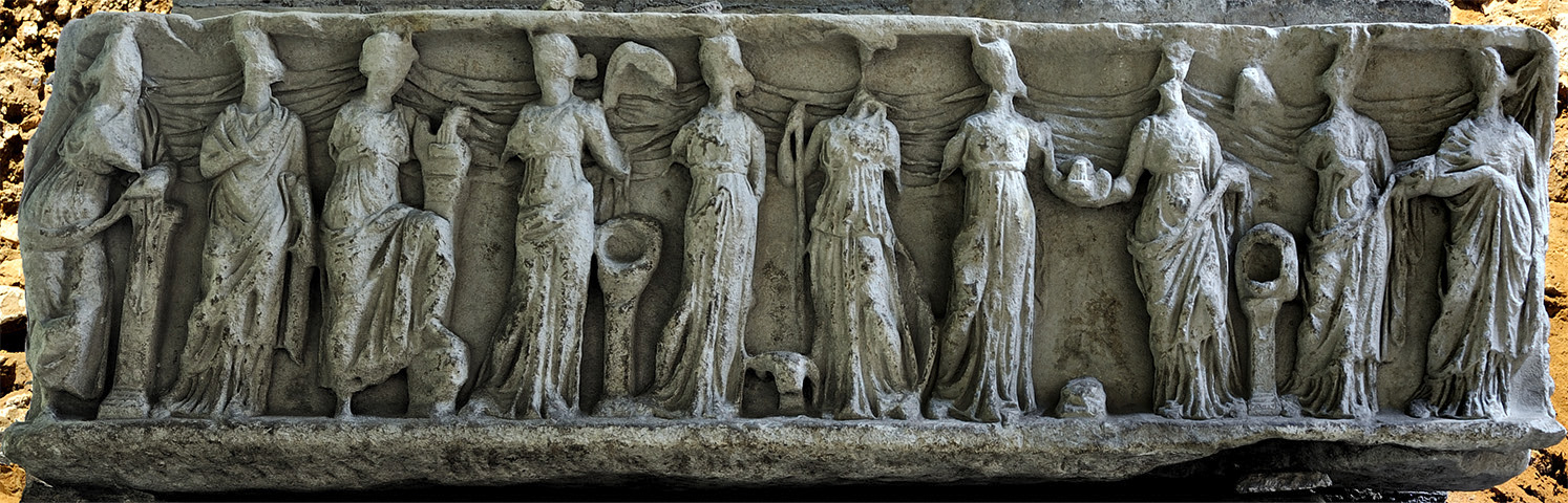 Девять муз, Афина и Аполлон. Деталь: Полигимния, Евтерпа, Талия, Мельпомена, Эрато. Рельеф фронтальной стенки саркофага. Мрамор. II в. н. э. Государственный Эрмитаж. Санкт-Петербург, Россия