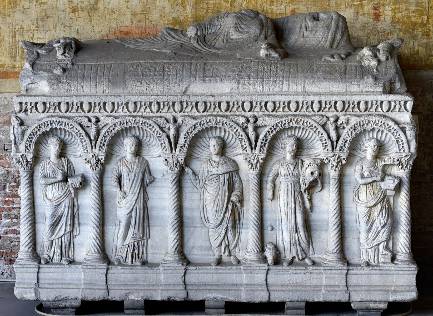 Саркофаг с изображениями покойных в окружении Муз в арках (фронтальная панель). Мрамор. Рим. Кампосанто. Пиза, Италия