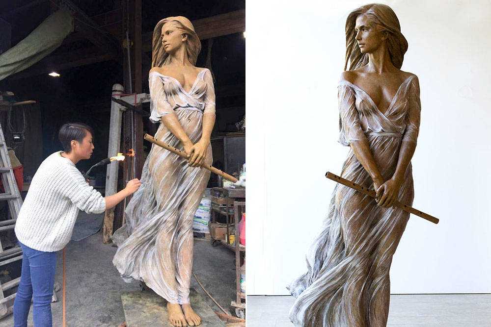 Скульптуры Лу Ли Ронг, как и древнегреческие образцы, выполнены в цвете, что делает их более реалистичными, чем работы предшественников. Особенно характерна фигура девушки с дудочкой. Она стоит прямо и задумчиво смотрит в сторону, пока ветер развевает ее нежно-голубое, почти прозрачное платье. В то, что бронзовая красавица носит бронзовое платье, поверить практически невозможно — настолько воздушным и невесомым оно выглядит.