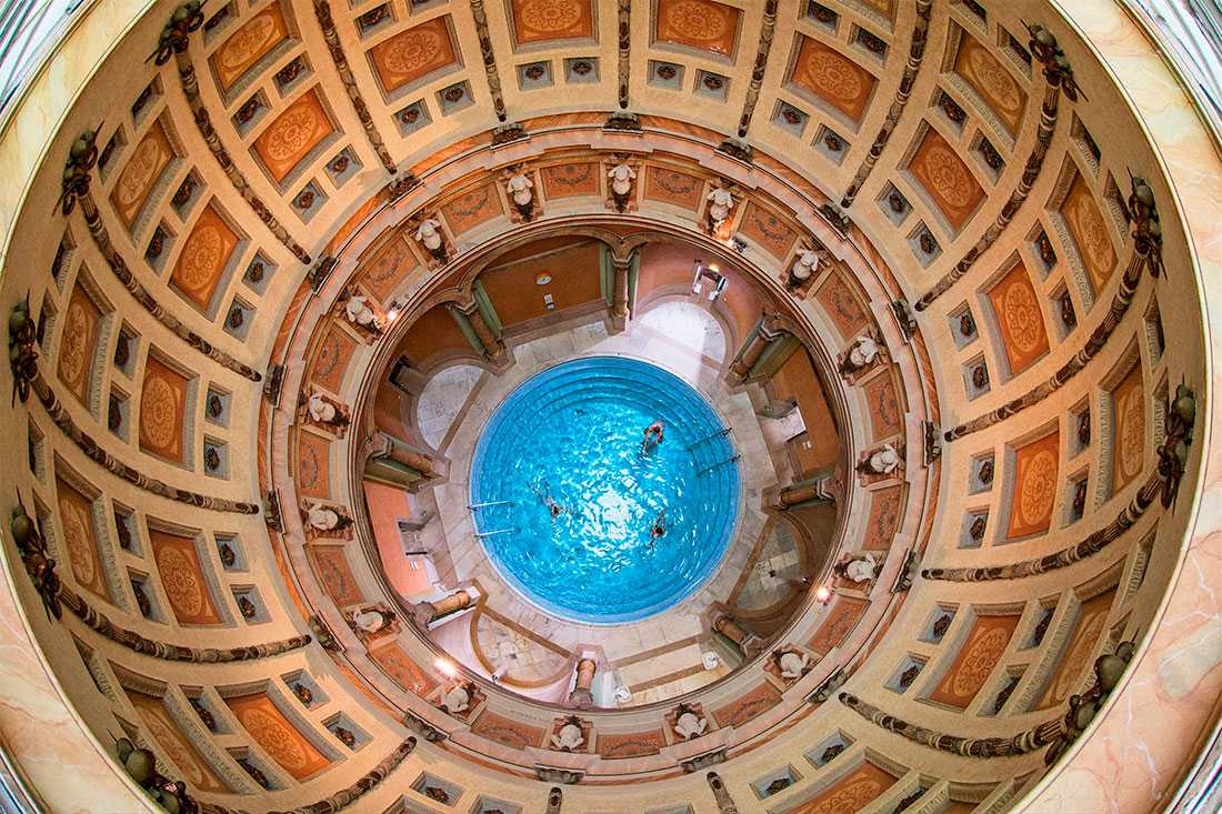 Банные сооружения обрамляет парк, внутри они декорированы под храмовые убранства Антики.
