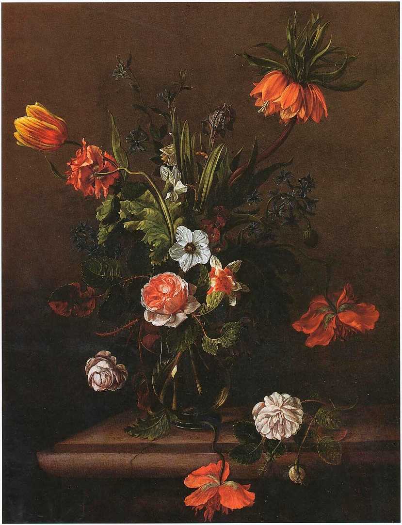 Считается, что цветочный натюрморт своей популярностью обязан всеевропейской великосветской моде на сады и садики. Может, и так, но, может, и нет, проверить нельзя. Я думаю, что одной из причин стала декоративность картин с розами и тюльпанами. Старинные панели, где цветут букеты, и сейчас превосходно смотрятся почти в любом интерьере, а четыреста лет тому назад, когда краски еще не пожухли, тем более. Мир вещей в 17 веке был без анилиновых красителей, а потому спокоен, яркость же привлекает. Веселые цвета манили, манят и будут манить публику. При всей популярности цветочного жанра было произведено сравнительно мало гравюр с цветами, потому что черно-белый оттиск с гирляндами и тюльпанами никак не мог явиться заменой красочных картин с ними.