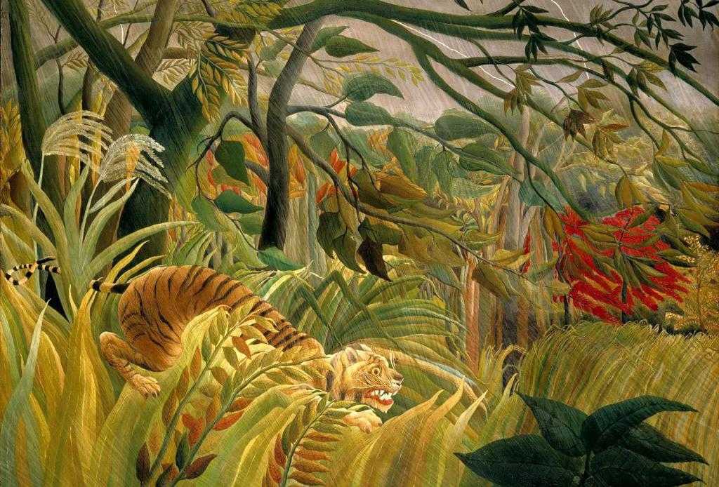 Самой первой картиной, изображавшей тропический лес, стала работа Tiger in a Tropical Storm. Она была выставлена в 1891 г. в Салоне независимых, где автор дал ей первоначальное название «Сюрприз». На ней изображен нападающий тигр во время бушующего ливня и урагана (тропического шторма). Все происходит при яркой вспышке молнии, когда животное приготовилось к прыжку, чтобы напасть на свою добычу.