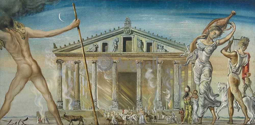 Произведение Сальвадора Дали – это скорее второй случай. Хотя в картине нет привычных сюрреалистических и фантастических образов, храм всё равно выглядит несколько иначе, чем на рисунках-реставрациях. Также заметны характерные для Дали изогнутые и вытянутые греков, находящихся на площади перед зданием.