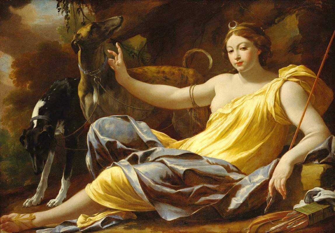 Часто Артемиду «украшали» на картинах шкурами зверей, тем самым подчёркивалась её охотничья слава. Дева-охотница отдыхает, наслаждаясь трофеями, что она смогла добыть во время преследования диких животных на землях Греции.